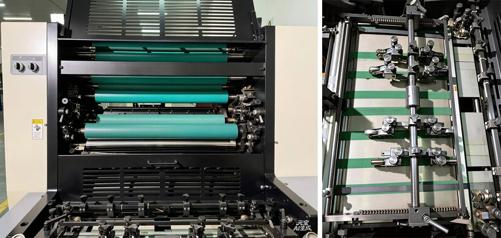 Seasann an Preas Priontála Fritháireamh Bileog Aon-Dath-Fed Páipéar Tiubh Mór A3 amach as a chuid gnéithe den scoth a fhágann go bhfuil sé iontaofa agus éifeachtach. Tá struchtúr meicniúil tromshaothair aige - bonn lárnach iarann ​​teilgthe, taobhphlátaí, agus rollóirí - mar sin tá sé láidir, docht, caitheamh-resistant, agus turraing-ionsúite. Ciallaíonn sé seo go ritheann sé go réidh fiú ag luas ard, a choinneáil brú priontála comhsheasmhach gach uair. Tá na sorcóirí priontála crómaithe in aghaidh caitheamh go han-mhaith, ag cuidiú leis an meaisín maireachtáil níos faide agus ag laghdú ar chostais chothabhála laethúla. Déanann imthacaí ardchruinneas agus giaranna helical bunaithe ar an tarchur cumhachta a bheith seasta agus réidh, gan aon ghiotaí ná glitches. Is tosaíocht í an tsábháilteacht freisin - cuirtear gléasanna sábháilteachta isteach i bhfeistiú pláta, glanadh, clúdaigh chosanta agus coigeartú doirse chun oibreoirí agus an meaisín a choinneáil sábháilte. Déanann rialú aeroibrithe do na rollóirí clutch agus dúch oibriú níos iontaofa, gan aon saincheisteanna gan choinne. Tá suíomh agus teannas tapa ag an meicníocht gléasta pláta, rud a shábháil am ar shocrú. Láimhseálann a chuid páirteanna iompair páipéir - ceann beathú, bord páipéir, treoraí tosaigh, agus greamairí - gach cineál páipéir, ó tiubh go tanaí. Coinníonn an friothálacha páipéir lámh swing rudaí réidh le linn ritheanna ardluais, agus cinntíonn na sorcóirí pláta agus blaincéad le fáinní iompróra priontaí ardchaighdeáin ar luas. Coinníonn grippers dúbailte-earrach páipéar daingean, gan aon slipping, fiú le linn jabanna priontála fada. Ina theannta sin, tá an córas glantacháin rolla dúch leath-uathoibríoch éasca le húsáid - laghdaítear an t-am glantacháin, luasann sé athruithe datha dúch, laghdaítear an t-ualach oibre, agus neartaíonn sé éifeachtacht táirgthe. Tá rialú PLC aige freisin agus scáileán tadhaill le comhéadan simplí, éasca le húsáid d'oibreoirí.